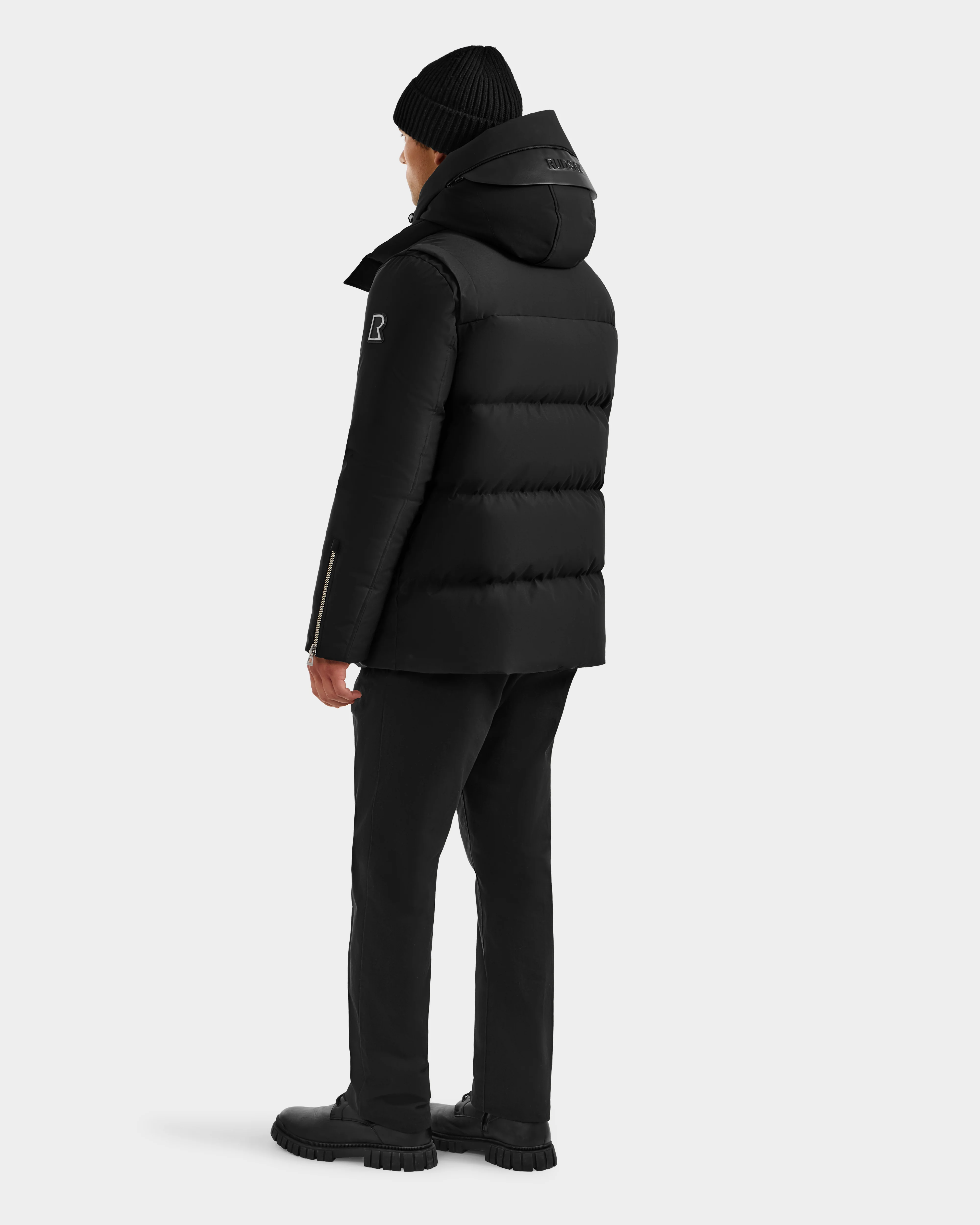 Meet APOLLO H by RUDSAK, a men’s quilted down parka engineered for peak winter performance. Designed in a wind- and weather-resistant shell, it features a removable hood with zip-in visor, zippered sleeve expanders, and storm-ready ribbed cuffs. Vegan leather trims add sleek edge to its straight silhouette, while high-loft 90/10 down fill offers superior warmth without the bulk. Equipped with inner backpack straps for hands-free carry, this timeless parka merges innovation, utility, and refined design.
