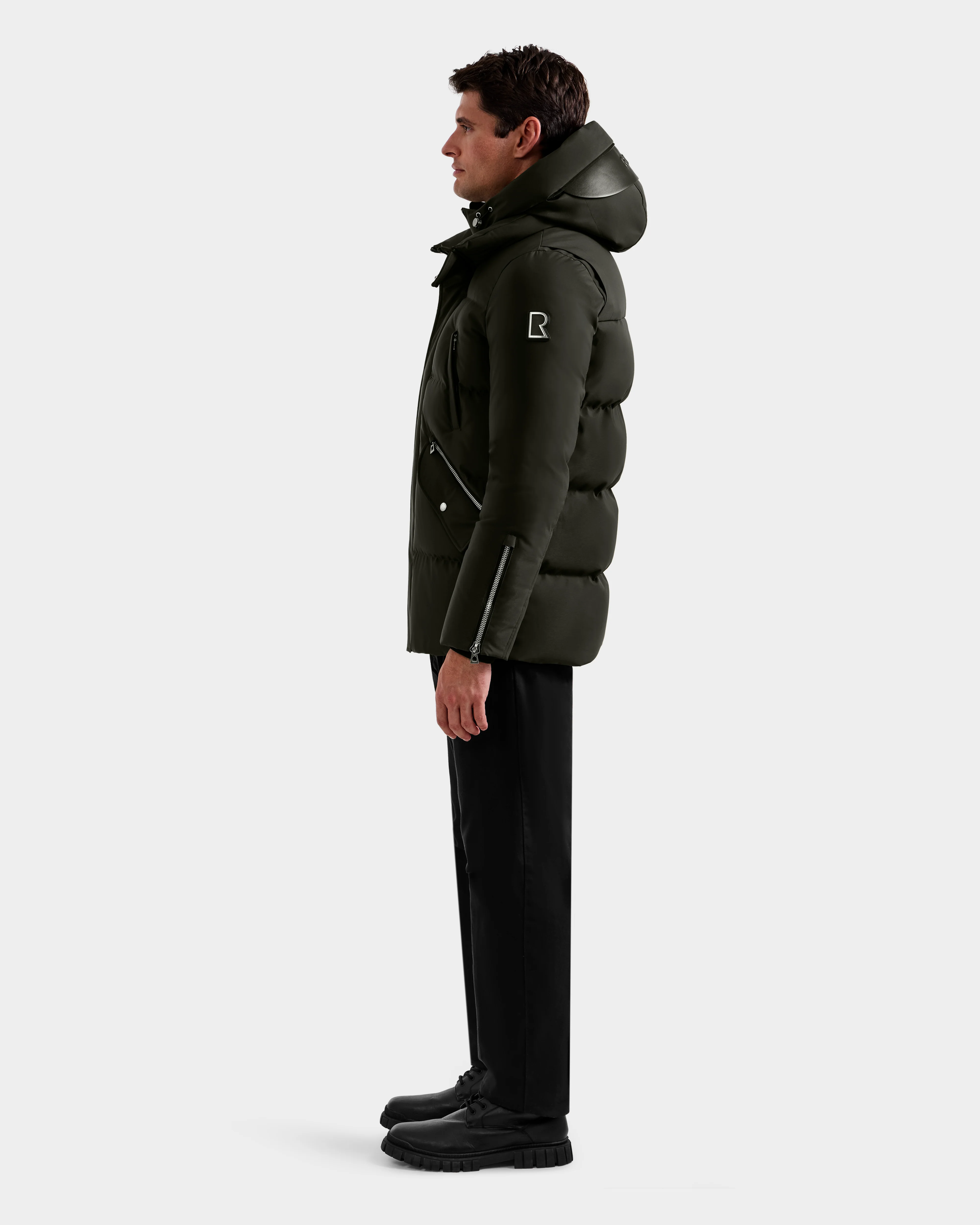 Meet APOLLO H by RUDSAK, a men’s quilted down parka engineered for peak winter performance. Designed in a wind- and weather-resistant shell, it features a removable hood with zip-in visor, zippered sleeve expanders, and storm-ready ribbed cuffs. Vegan leather trims add sleek edge to its straight silhouette, while high-loft 90/10 down fill offers superior warmth without the bulk. Equipped with inner backpack straps for hands-free carry, this timeless parka merges innovation, utility, and refined design.