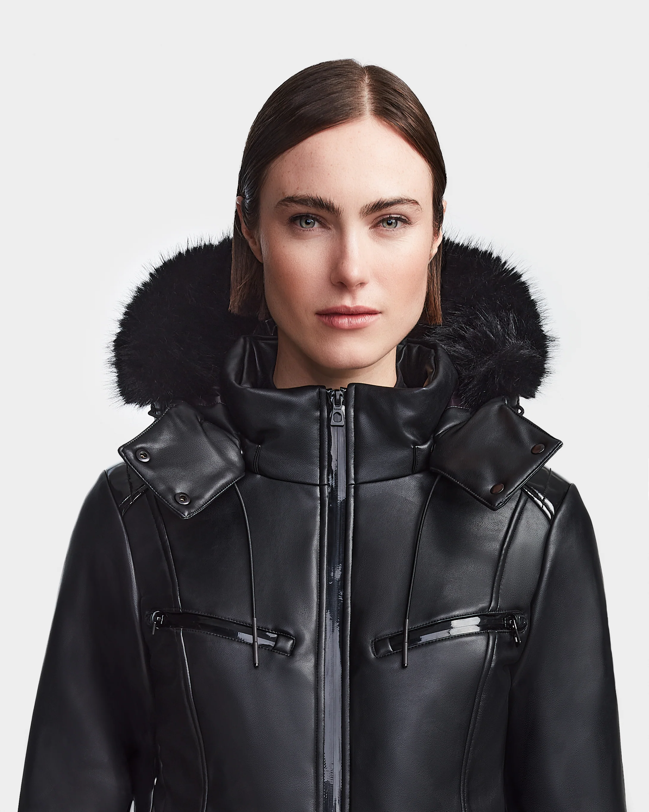 The BIANCA by RUDSAK is a striking women's ski suit that will have you standing out on the slopes in style. Designed in a stretch vegan leather and insulated with premium sustainable SORONA fill, this fitted snow suit has you covered down to -15C. The perfect fusion of fashion and function, it features an adjustable elasticized belt to accentuate its silhouette, a removable hood with removable faux fur, waterproof zippers, storm cuffs and convenient sleeve pockets. Its pants have a flare finish with an expansion zipper for easy wear over ski boots. Join RUDSAK’s ski club this winter and stand out on the mountains in this exclusive style.